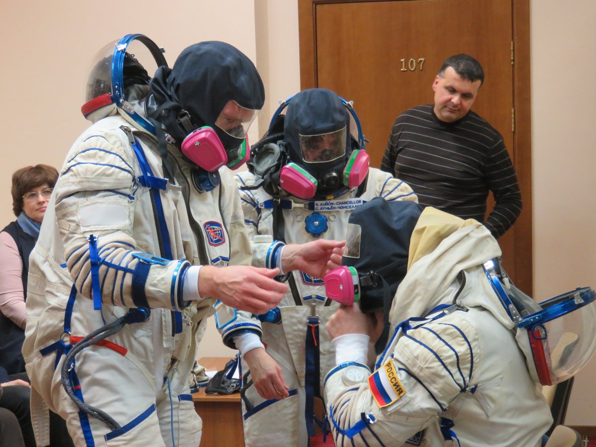 Putting on a space suit while wearing an ammonia mask. Not the best day on #ISS. Luckily just an emergency simulation. Great team building in any case. I suggest to put that exercise on the curriculum of business management courses...  ;)  @AstroSerena #SoyuzMS09