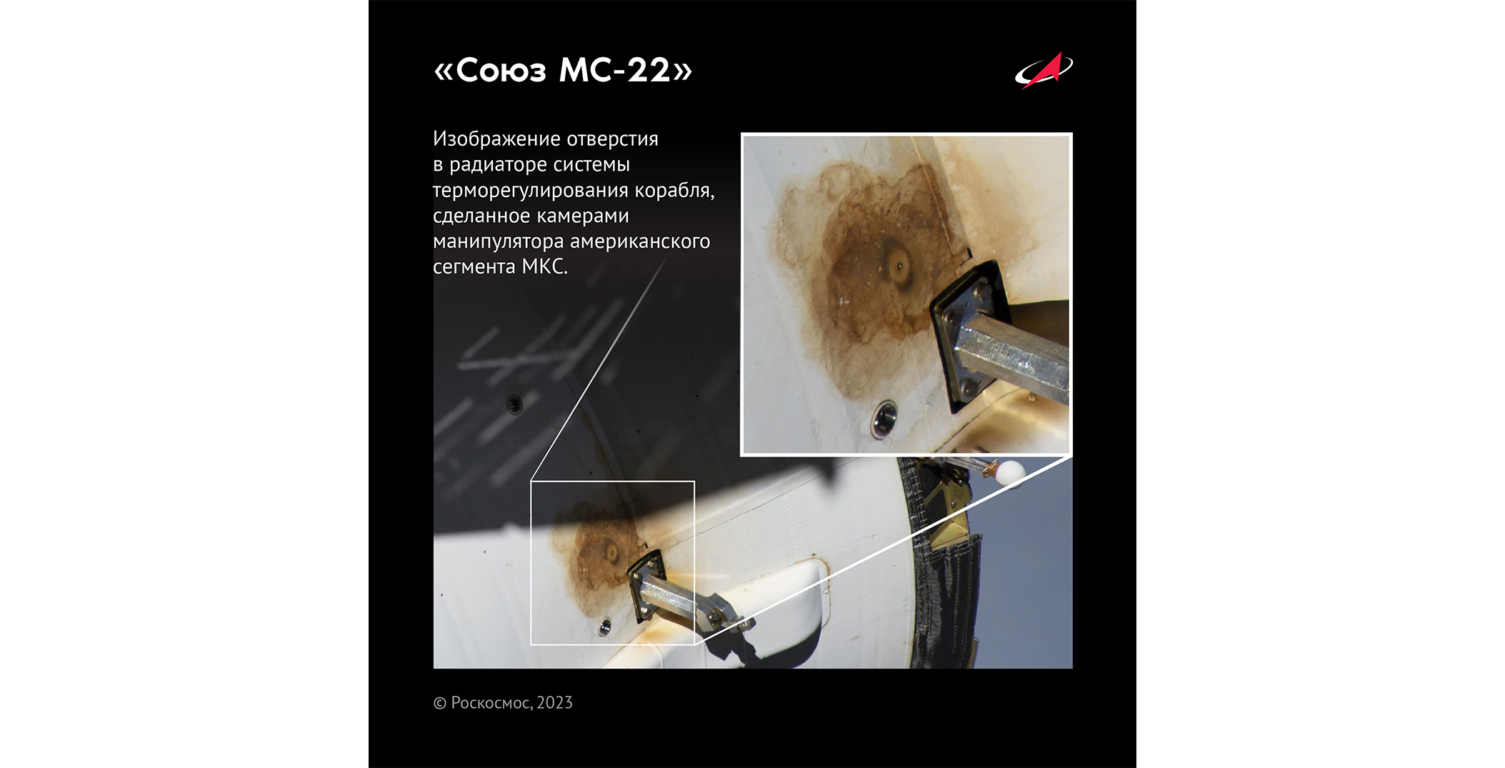15 декабря 2022 года в "Роскосмосе" сообщили (https://www.interfax.ru/russia/877021?utm_source=interlink&utm_medium=901597) об отмене выхода в открытый космос с борта МКС российских космонавтов из-за разгерметизации контура наружного радиатора корабля "Союз МС-22". 11 января глава "Роскосмоса" Юрий Борисов сказал (https://www.interfax.ru/russia/880265?utm_source=interlink&utm_medium=901597), что корабль был поврежден метеороидом. Диаметр повреждения на поверхности приборного отсека корабля составил до 1 мм.