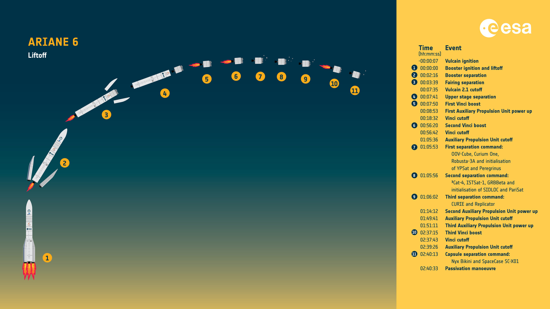 К этому моменту Ariane 6 должна выполнить свою работу, запустив разгонную ступень, развернув восемь спутников и активировав все бортовые эксперименты.