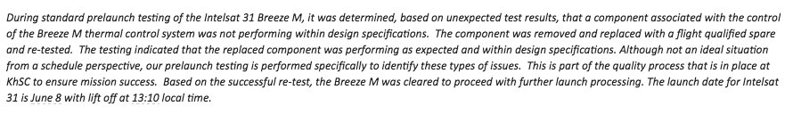 ЦитатаAs of 17 May, the launch of Intelsat 31 is on hold temporarily. A new launch date will be announced shortly.