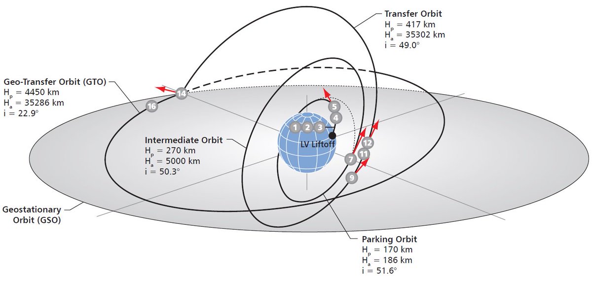 The Breeze M main engine ignited around 11 minutes after liftoff to place the Amazonas 5 satellite into a preliminary low-altitude parking orbit. Four more Breeze M firings were supposed to maneuver the spacecraft into a higher orbit with an apogee, or high point, of of 21,925 miles (35,286 kilometers), a perigee, or low point, of 2,765 miles (4,450 kilometers), and an inclination of 22.9 degrees to the equator.