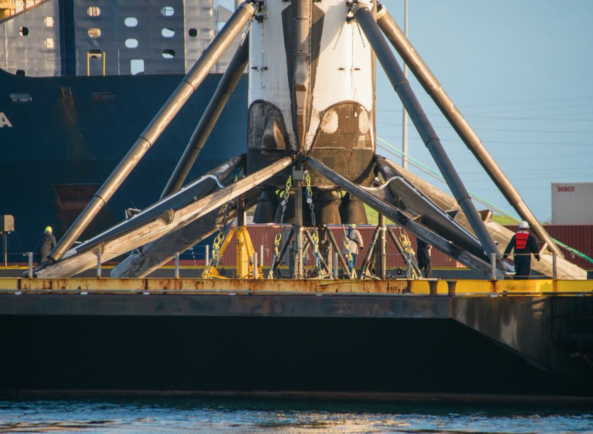 The @SpaceX (https://twitter.com/SpaceX) Go Searcher returned to Port Canaveral tonight with some rocket part on deck: https://www.flickr.com/photos/29418863@N04/albums/72157686191312452 ... (https://t.co/3nqpZxFw6q) Quickly offloaded in dark