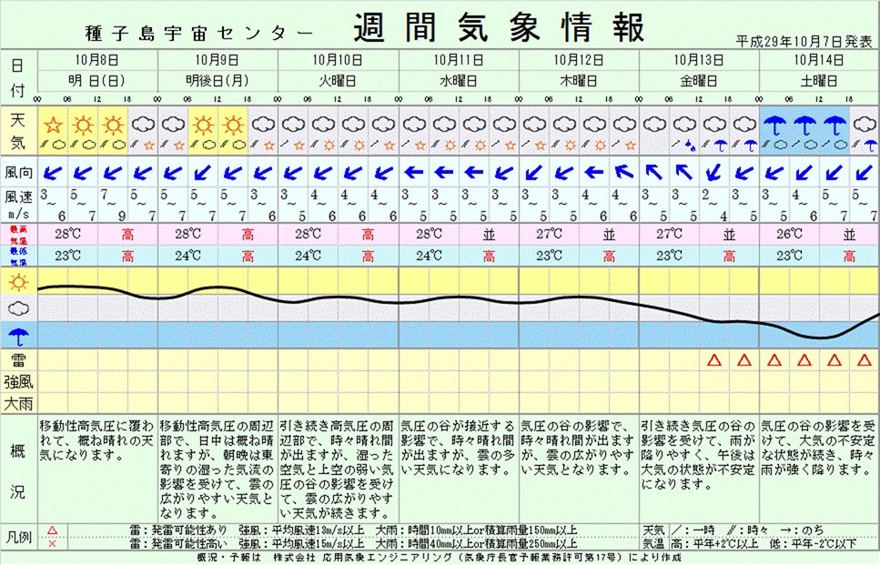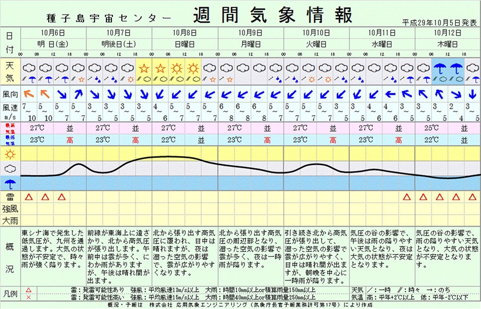 10月9日夕刻のH-ⅡAF36機体移動時の天候はまぁまぁ。 #H2AF36 (https://twitter.com/hashtag/H2AF36?src=hash) #QZS4 (https://twitter.com/hashtag/QZS4?src=hash) 種子島宇宙センター週間気象情報 http://space.jaxa.jp/tnsc/tn-weather/data/weekly.gif ... (https://t.co/tQ5h2DkRr7)