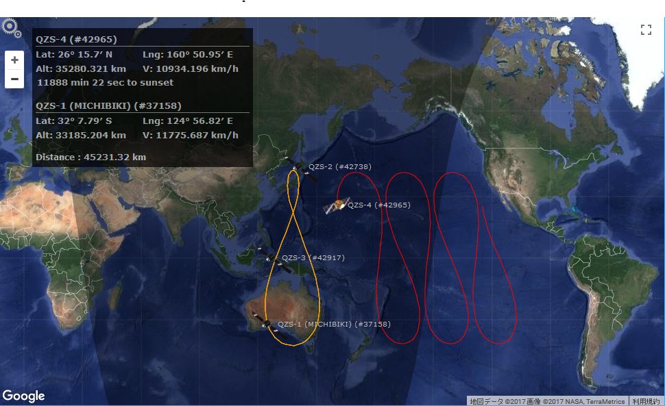 .@lizard_isana (https://twitter.com/lizard_isana) さんのGoogleSatTrackで、先日上がった みちびき4号機の起動をみてみよう。 徐々に準天頂軌道へ調整中。 http://www.lizard-tail.com/isana/tracking/?catalog_number=42965,37158,42738,42917 ... (https://t.co/19UoTFIxzb)