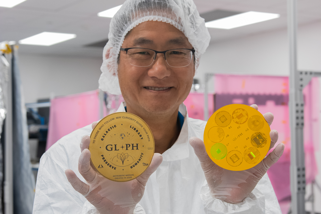 Above: Bruce Ha, inventor and founder of Nanofiche, holds a portion of the Galactic Library to Preserve Humanity (GLPH) as the team prepares it for integration with Griffin.
