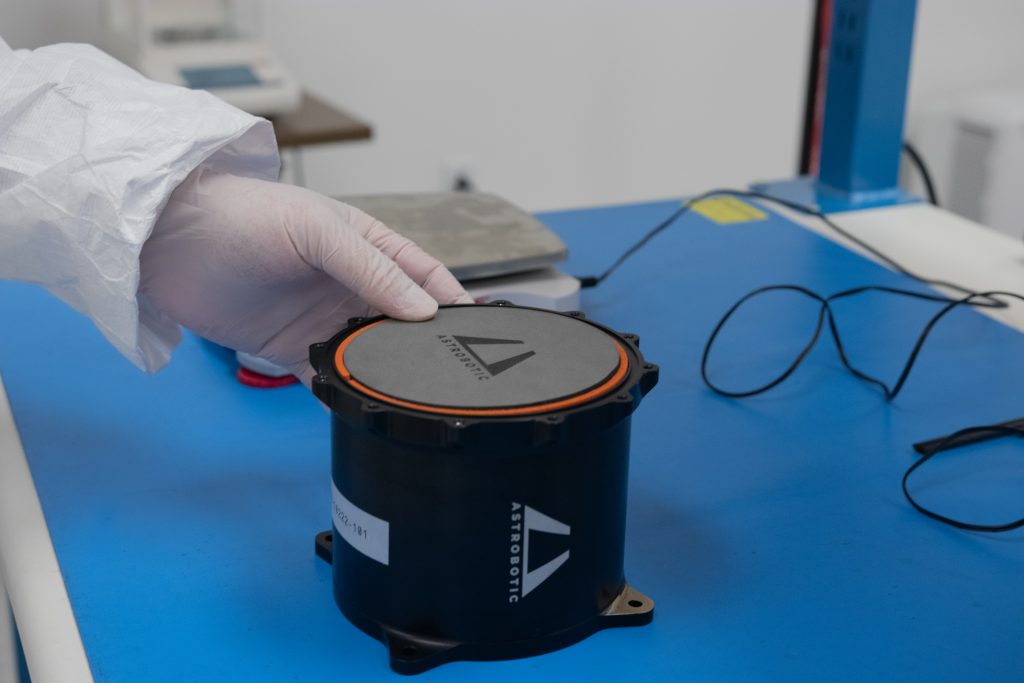 Above: Items from around the world will be sent to the Moon aboard this MoonBox capsule. An engineer places a piece of foam at the top of the capsule before it is sealed for integration aboard Griffin-1.