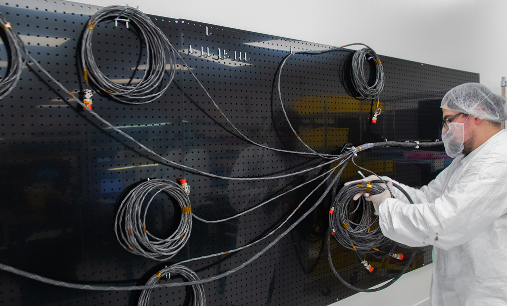 Above: Griffin's propulsion infrastructure, including tubing, cabling, and harnessing, was primarily manufactured in-house. An Astrobot applies protective sheathing to the last 95% of flight harnessing that's being integrated to the Griffin-1 lander.