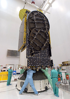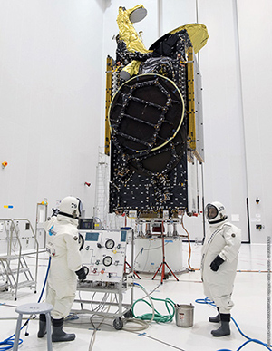 This milestone occurred with the relay satellite's installation atop a cone-shaped adapter that will serve as its interface when mated to the launch vehicle. The activity took place in the Spaceport's S5 payload preparation facility, and is to be followed by EUTELSAT 65 West A's transfer to the Ariane 5 Final Assembly Building for integration with the launcher.