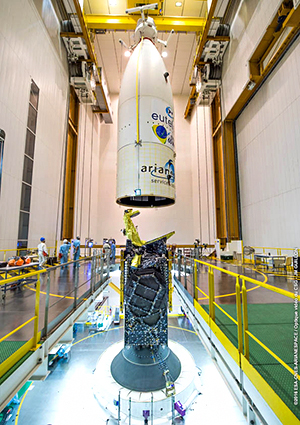 During activity in the Spaceport's S5 payload preparation facility at French Guiana, EUTELSAT 65 West A is installed atop the adapter that is to serve as the interface with its Ariane 5 launch vehicle.