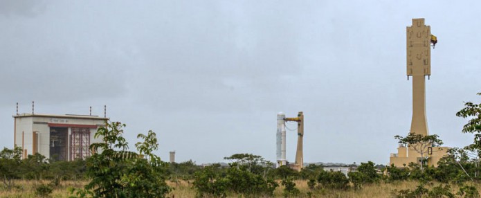 The launcher rolled out today fr om the Spaceport's Final Assembly Building to the ELA-3 launch zone at this near-equatorial facility – wh ere Ariane 5 is scheduled for liftoff during a three-hour window that opens Wednesday at 2:20 a.m. local time in French Guiana.