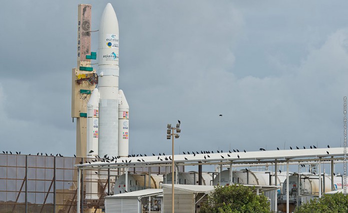 Arianespace has delivered another Ariane 5 to the launch zone at Europe's Spaceport in French Guiana, positioning this workhorse vehicle for its March 9 early morning mission with the EUTELSAT 65 West A relay satellite.