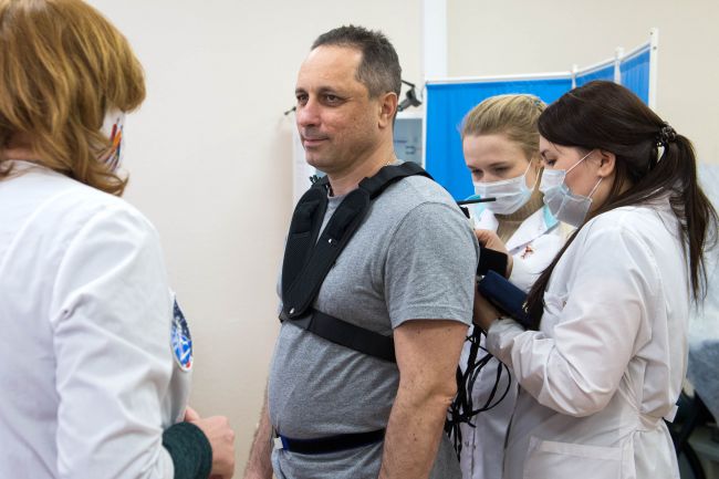 Эксперимент «Профилактика-2» тоже проводится в несколько этапов, в том числе на МКС. На космонавте – датчики и маска. Он выходит на велодорожку и должен развить определенную скорость. Помимо прочего замеряют дыхание, а до и после сеанса проводится анализ крови. На один рабочий день может выпасть до трех медико-биологических исследований, а помимо них реабилитационные и другие мероприятия.