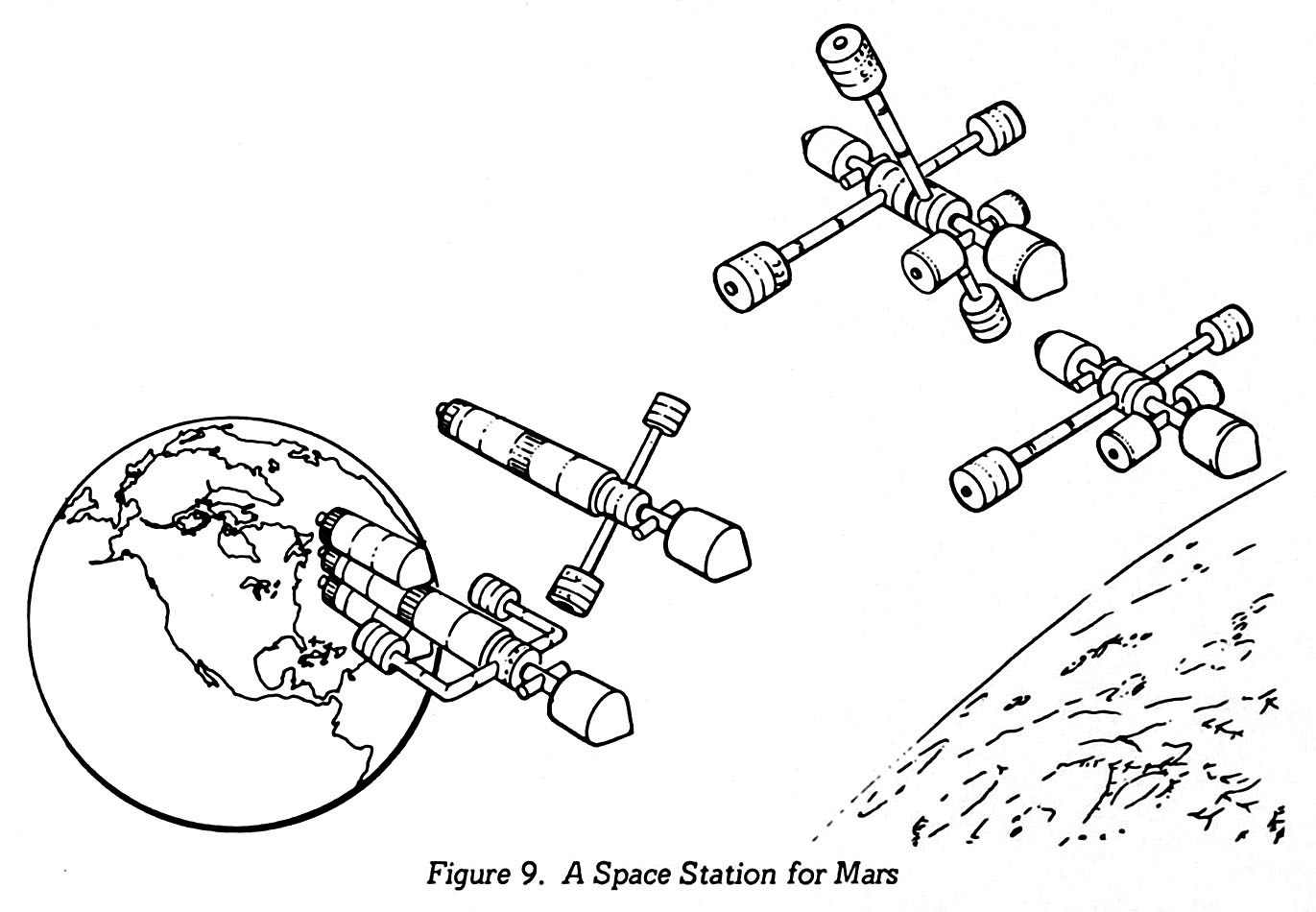 "Кoнцeпция opбитaльнoй cтaнции, c кoтopoй люди мoгли бы coбиpaть и oбcлyживaть кocмичecкиe aппapaты, нaпpaвляющиecя нa Лyнy или плaнeты, являeтcя oднoй из paccмaтpивaeмыx идeй.