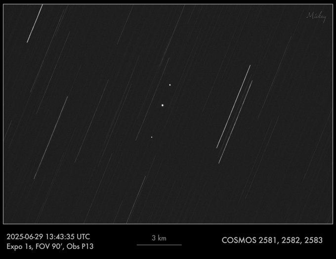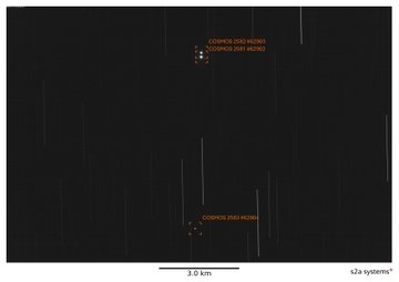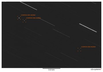 Эти три Космоса продолжают летать в непосредственной близости. Недавно наблюдалось сближение К-2583 с К-2581 на расстоянии менее 100 метров.