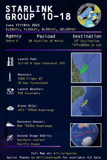 ЦитироватьSpaceX is targeting Wednesday, June 18 for a Falcon 9 launch of 28 Starlink satellites to low-Earth orbit from Space Launch Complex 40 (SLC-40) at Cape Canaveral Space Force Station in Florida. Liftoff is targeted for 1:38 a.m. ET, with backup opportunities available until 5:38 p.m. ET. If needed, additional opportunities are also available on Thursday, June 19 starting at 1:16 a.m. ET.
