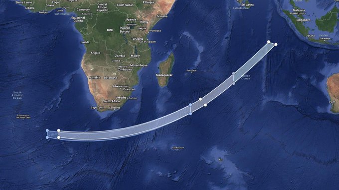 LHA map for #Starlink Group 6-76 from KSC LC-39A NET 26 Nov 03:35 UTC, alternatively 27 to 30 Nov based on issued NOTAM/NOTMARs. Planned booster recovery 600km with estimated fairing recovery ~670km downrange. S2 debris reentry area in Indian Ocean. http://bit.ly/LHA-44