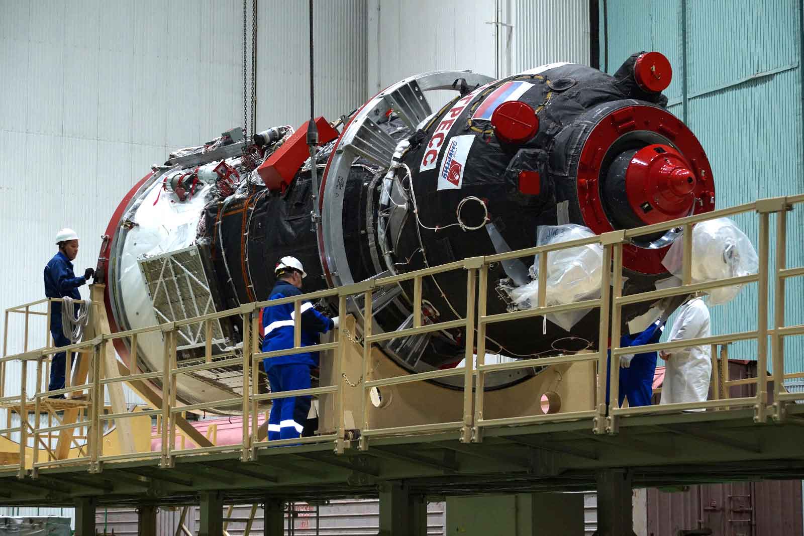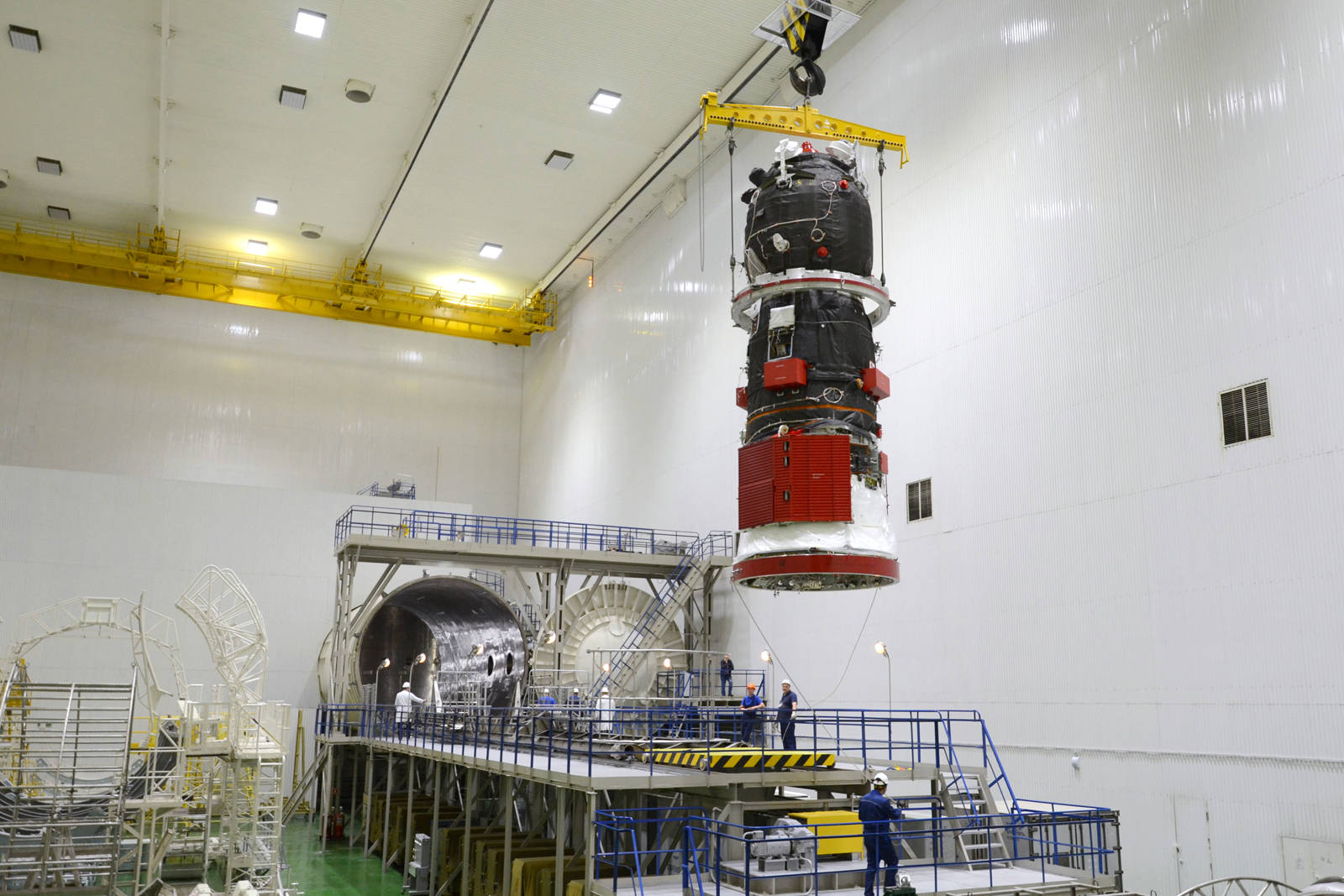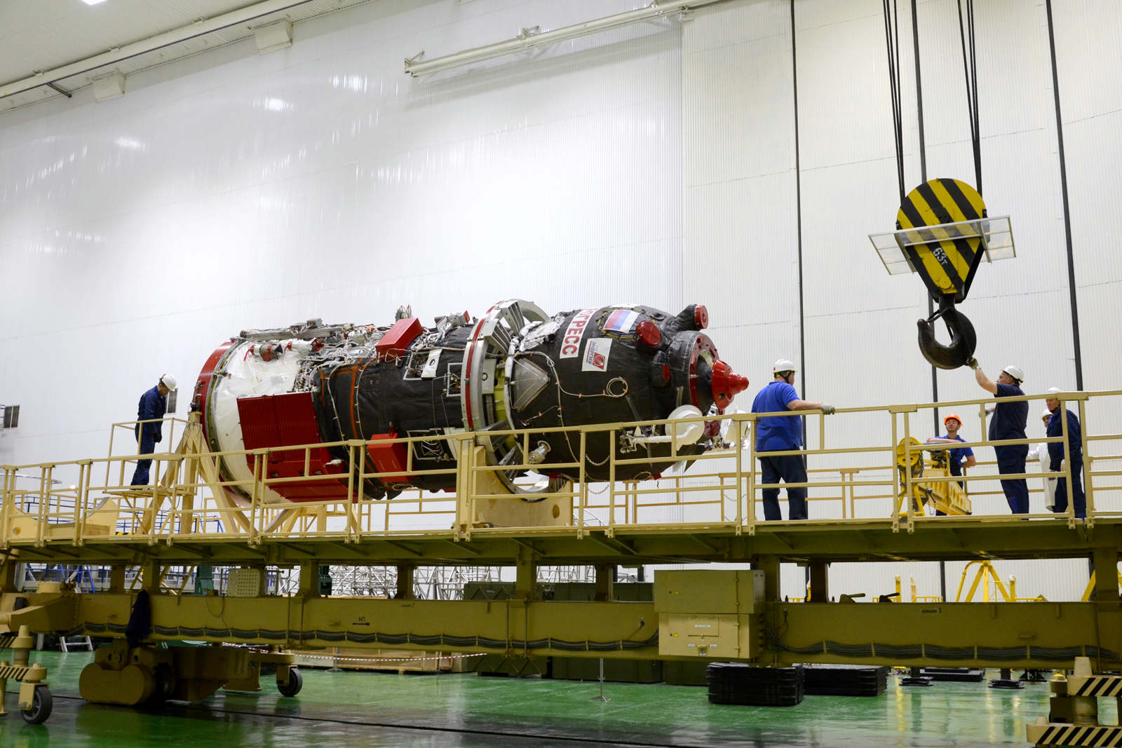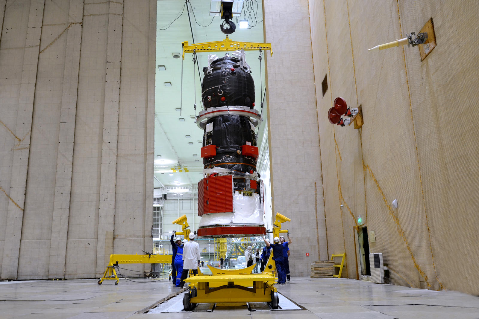 В настоящий момент идут работы по выгрузке и установке корабля на рабочее место для проведения процедуры приемки для дальнейшей подготовки к запуску согласно графику работ.