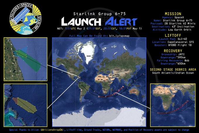 ЦитироватьSpaceX is targeting Thursday, May 1 for a Falcon 9 launch of 28 Starlink satellites to low-Earth orbit from Space Launch Complex 40 (SLC-40) at Cape Canaveral Space Force Station in Florida. The four-hour launch window opens at 9:51 p.m. ET, with backup opportunities available until 1:51 a.m. ET on Friday, May 2. If needed, additional opportunities are also available on Friday, May 2 starting at 9:25 p.m. ET.