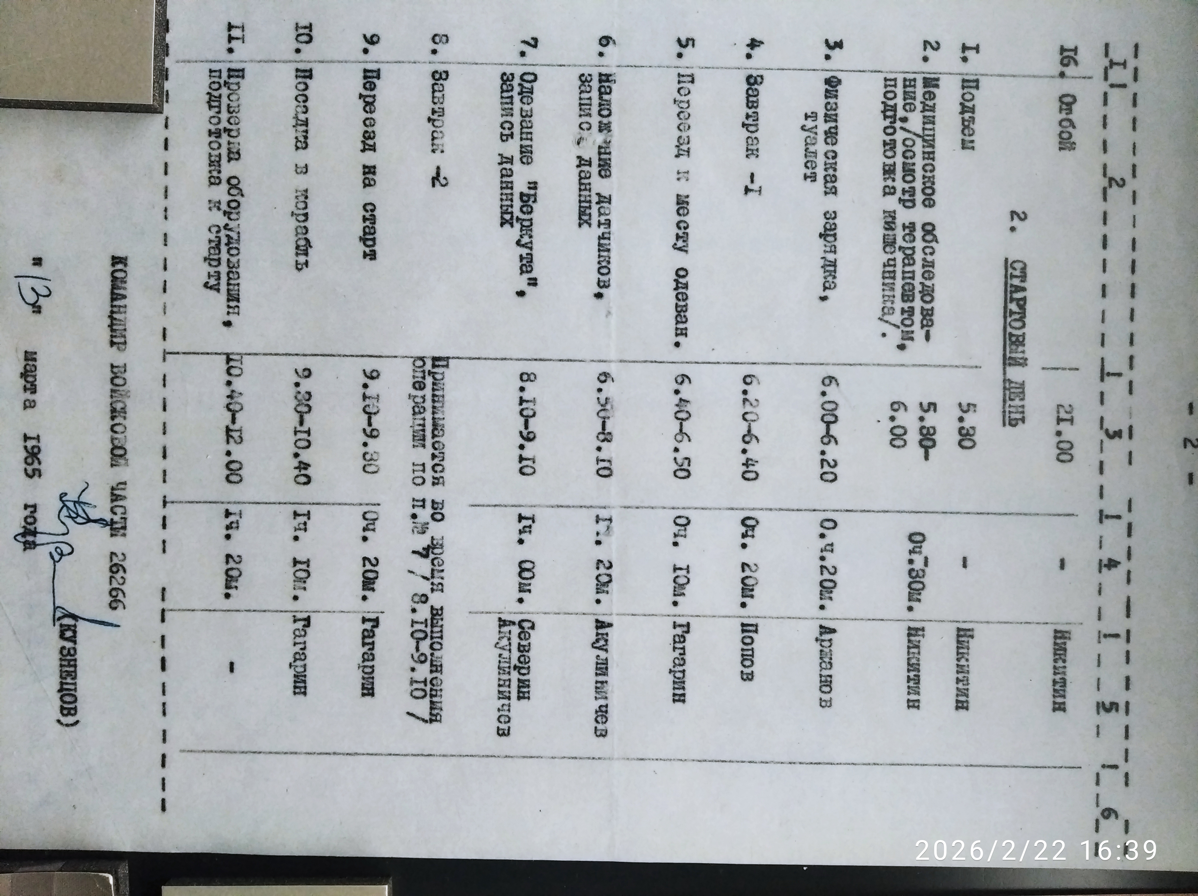 Распорядок стартового дня для космонавтов Восхода-2: