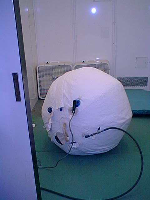 Inside the PRS, or "personal rescue sphere".  For astronauts, a PRS is a way to get from a disabled station or shuttle to a rescue ship.  For interviewees, it's a test of claustrophobia.