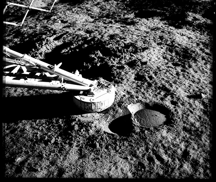 This picture of the number 2 footpad of Surveyor 3 was taken by Apollo 12 astronaut Alan Bean on the second moonwalk EVA on 20 November 1969. Surveyor 3 landed on the Moon on 20 April 1967 on the slope of a small crater.