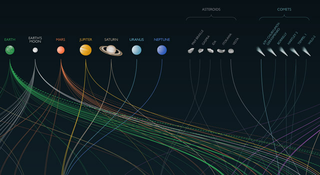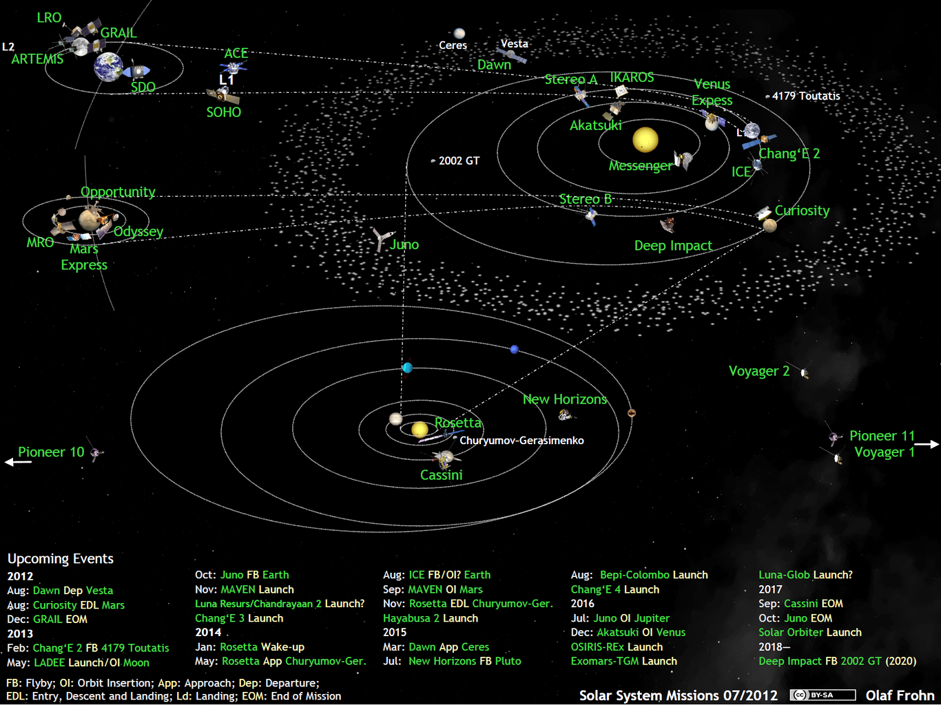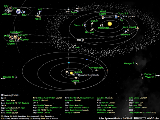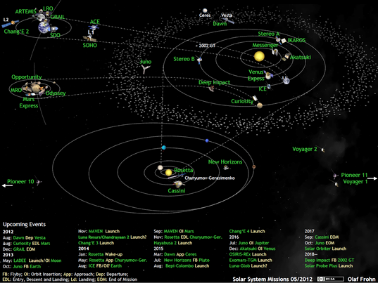 Turning to the activities of robots across our solar system, this month will see GRAIL begin its science mission measuring the Moon's gravity field. MESSENGER will complete its primary mission at Mercury, celebrating its one-Earth-year-in-orbit anniversary with a big data release, and immediately begin work on its one-year extended mission. Mars will pass its solstice, ushering in warmer days for Opportunity. Coincidentally, this month will see Jupiter's southern winter solstice, too, though there are no spacecraft there to notice it. Out at Saturn, Cassini will have two encounters with Enceladus this month, one of them distant, one of them at 74 kilometers altitude. Here's Olaf Frohn's diagram of where all our wandering spacecraft are as of Wednesday. Compare it to last month's to see how things have moved.