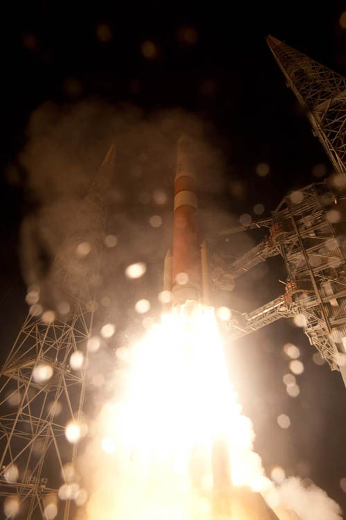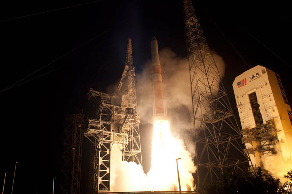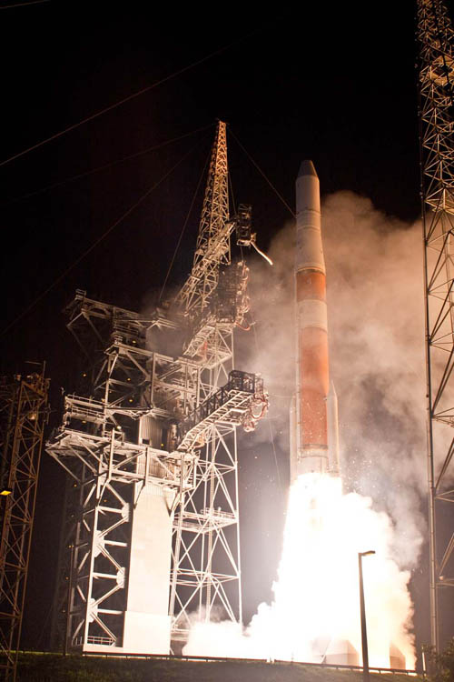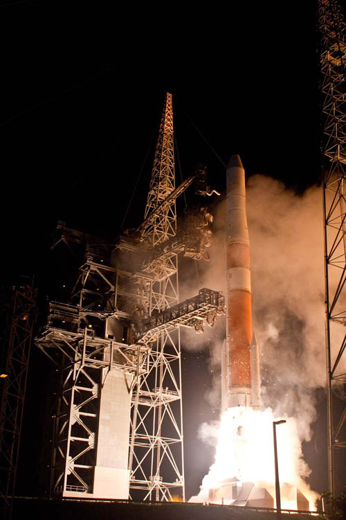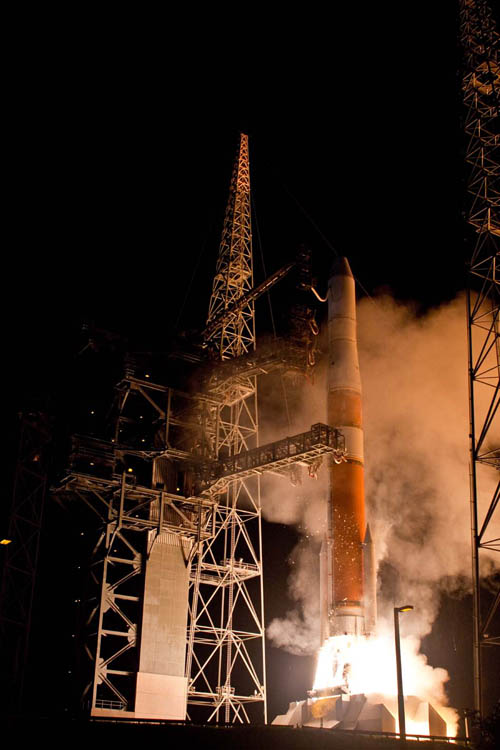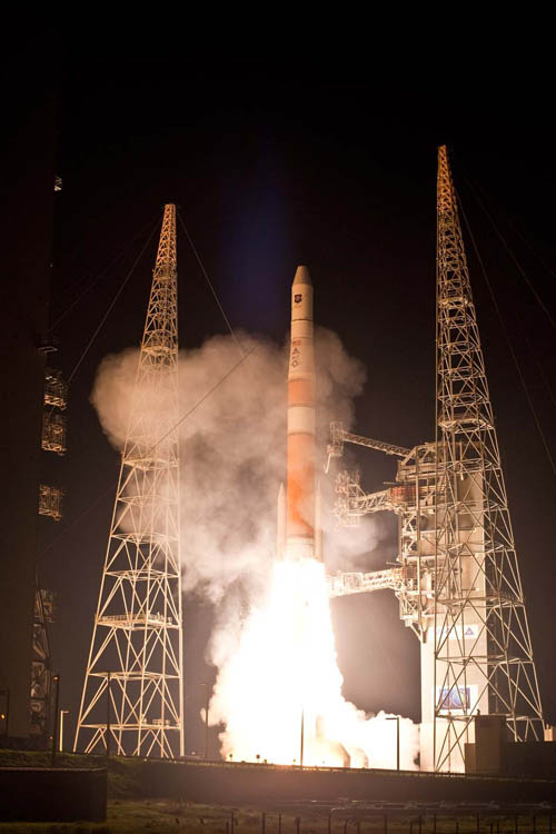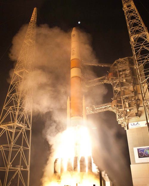 The spacecraft was lifted into orbit by a United Launch Alliance Delta IV Medium+ rocket flying for the eighth time in a 4-2 configuration. Its single Pratt & Whitney Rocketdyne RS-68 first stage engine was supplemented by two Alliant Techsystems strap-on solid rocket motors. The four-meter upper stage used a PWR RL10B-2 engine.