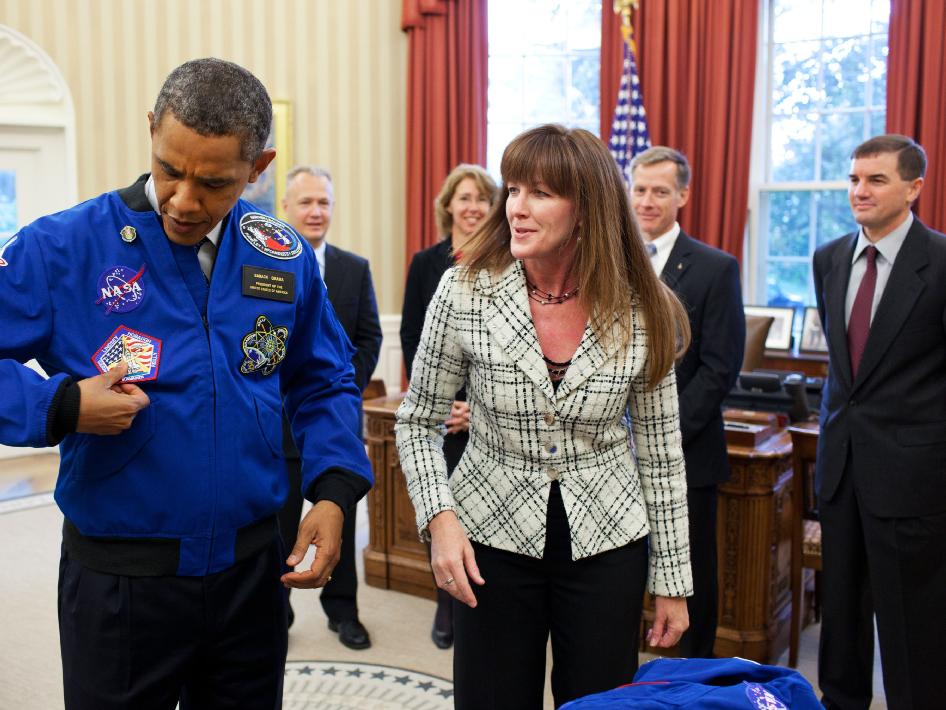 From left , Space Shuttle Atlantis STS-135 Pilot Doug Hurley, Mission Specialist Sandy Magnus, Commander Chris Ferguson and Mission Specialist Rex Walheim watch from the background as Janet Kavandi, Director of Flight Crew Operations at Johnson Space Center, Texas, presents President Obama with a coat from Space Shuttle Atlantis's final mission, in the Oval Office, Nov. 1, 2011.