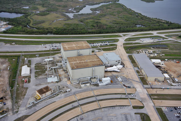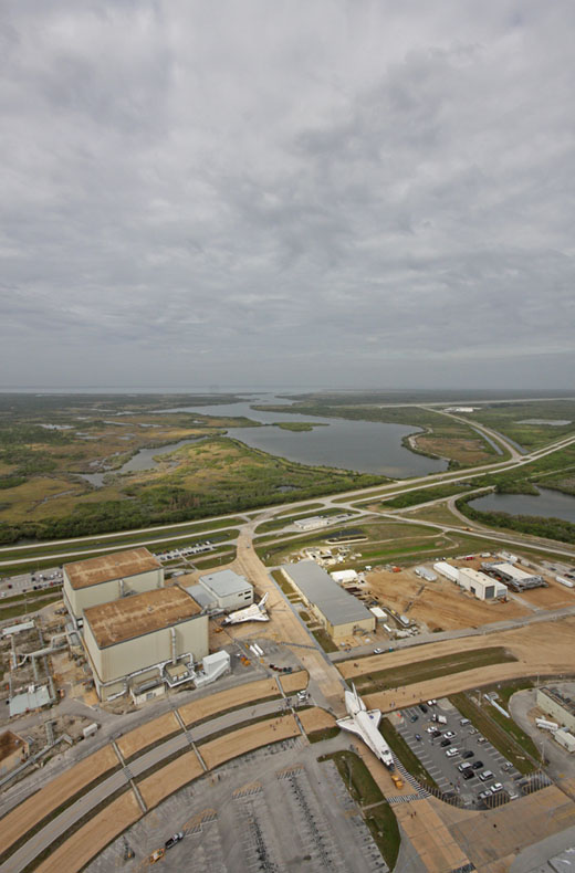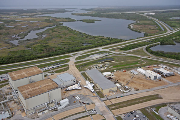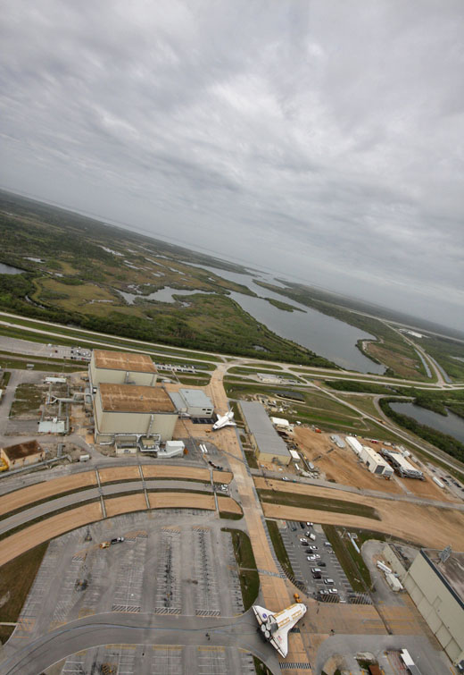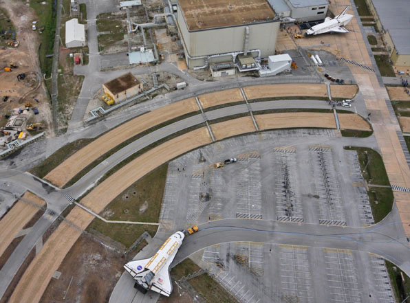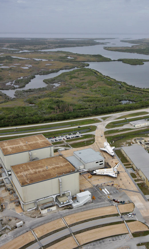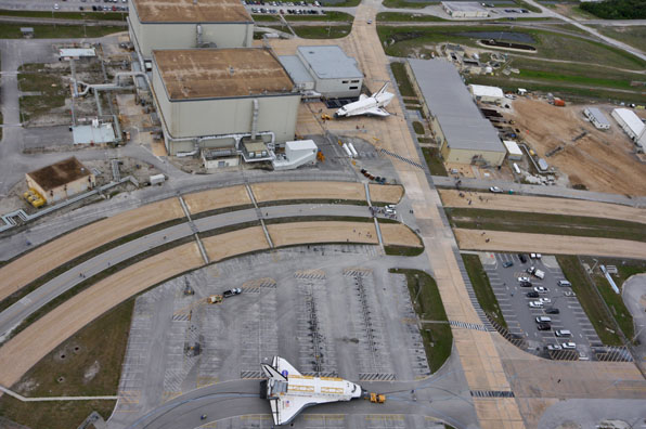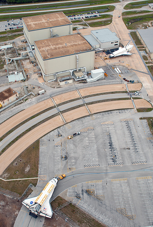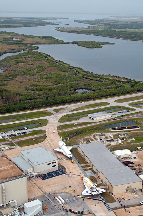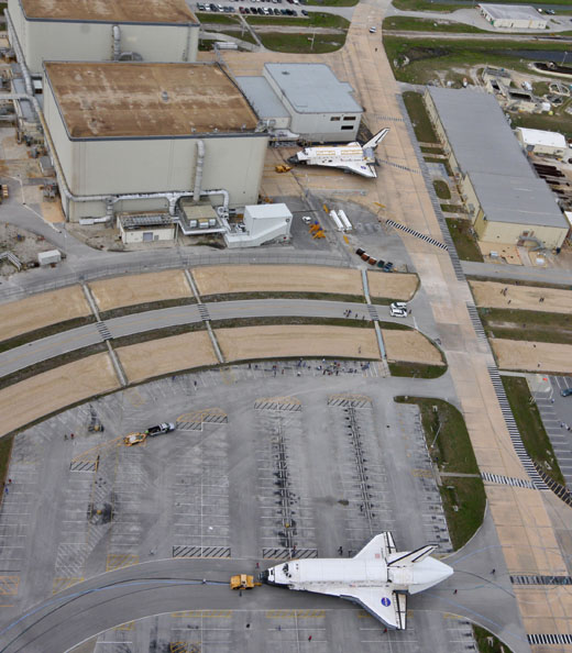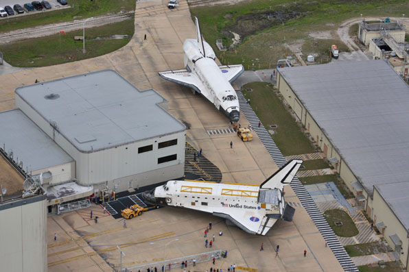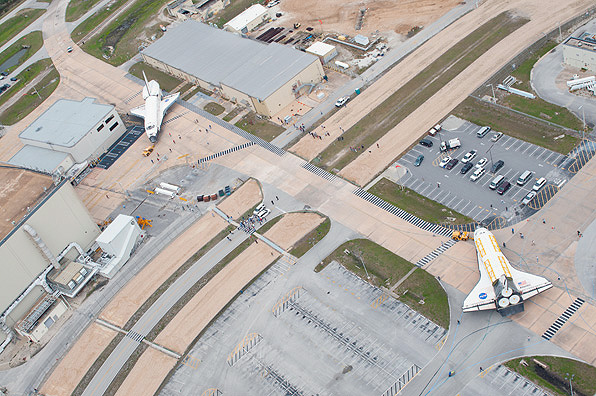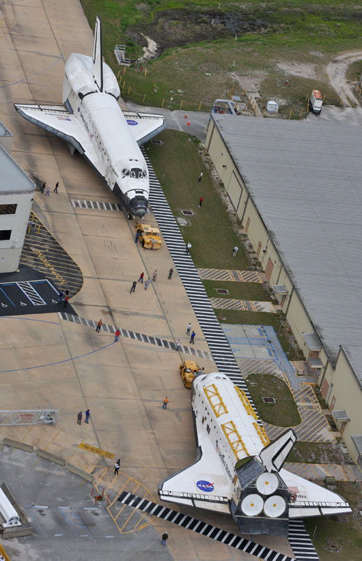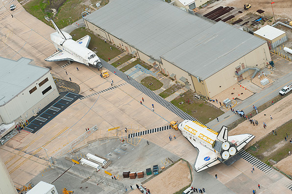 With only two shuttle hangars still in use and three orbiters, NASA has been shuffling shuttles during the recent retirement activities. A similar double shuttle sighting like today's was seen last summer.