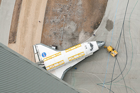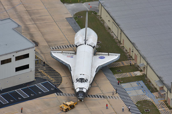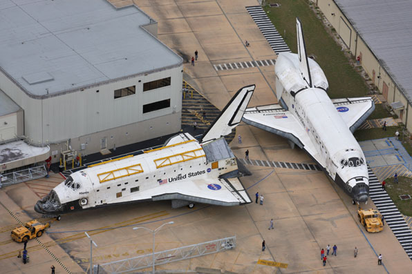 Endeavour is in the other hangar being prepped for delivery to the California Science Center in Los Angeles this fall; Atlantis will finish the decommissioning process before being driven down the road to KSC's Visitor Complex either late this year or early next.