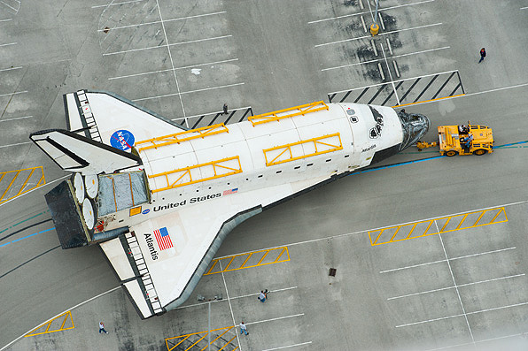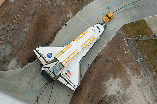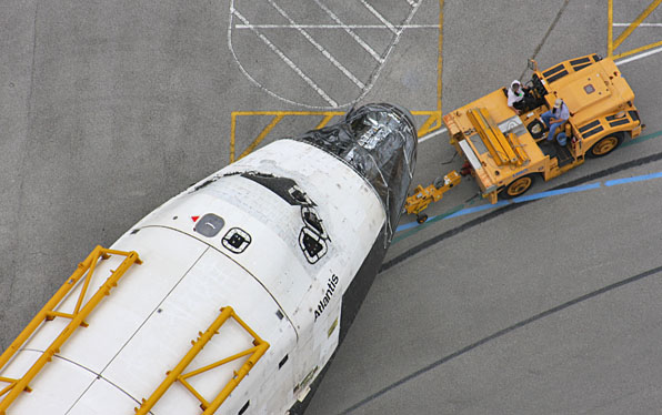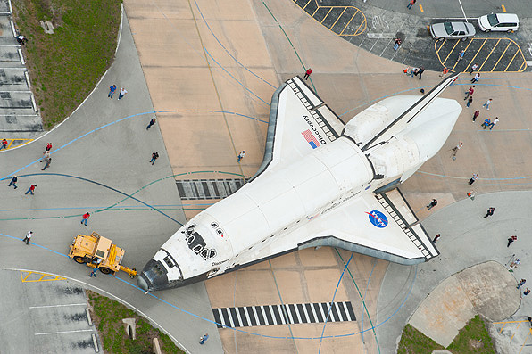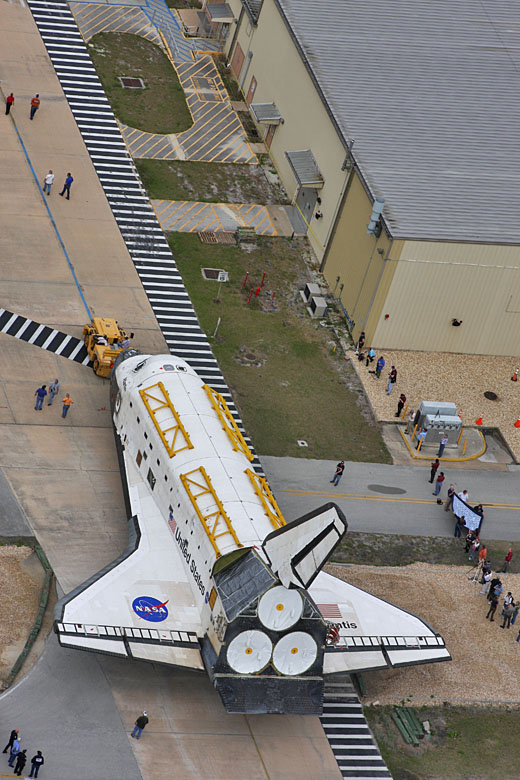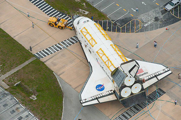 Накануне утром Atlantis вывезли из сборочного ангара в центре им. Кеннеди и установили на специальной многоколёсной платформе. Дорога до музея не длинная, примерно 16 км, однако конструкция двигалась к музею весь день.