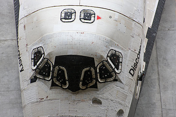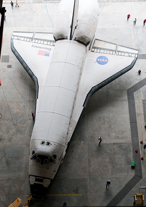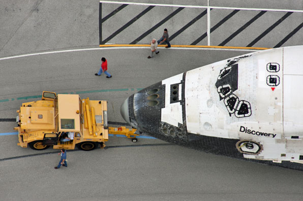 Once at the Northern Virginia airport, a special dual crane system will remove the 166,000-pound spaceplane from the 747 and lower Discovery onto her landing gear tires. She will be towed into the museum in a public parade with the U.S. Marine Drum and Bugle Corps leading the way on April 19.