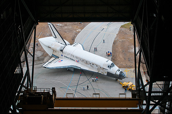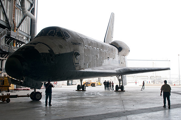 ЦитироватьExactly one year to the day since returning from her final spaceflight and now ready for public display at the Smithsonian, the most-flown space shuttle orbiter was rolled from the Kennedy Space Center hangar and placed into temporary storage at the Vehicle Assembly Building today.