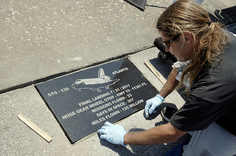 Мемориальная доска установлена на полосе № 15 на мысе Канаверал, в месте, где после пробега остановилось носовое колесо "Атлантиса".