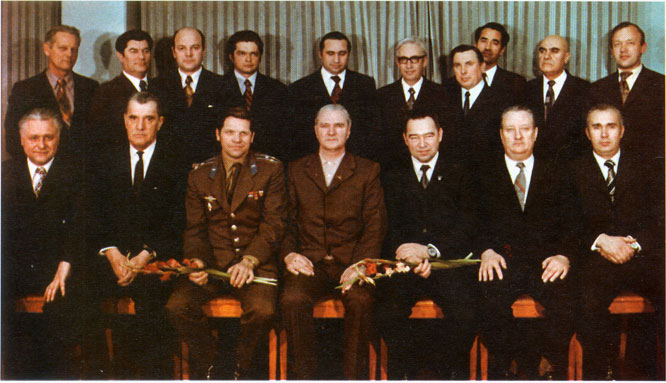 Person on the right of Glushko - although only partially seen - must be Kubasov, as other people could be officials of CKBM (RKK "Energiya") involved in the ASTP project.