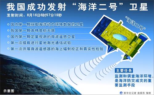 Тайюань, 16 августа /Синьхуа/ -- Сегодня в 06:57 с Тайюаньского космодрома /пров. Шаньси, Северный Китай/ с помощью ракеты-носителя "Чанчжэн-4Б" /"Великий поход-4Б"/ был успешно произведен запуск океанографического спутника "Хайян-2".