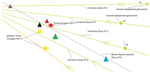 Черная линия — виток Луна27-0 при сбросе маяков по мере движения