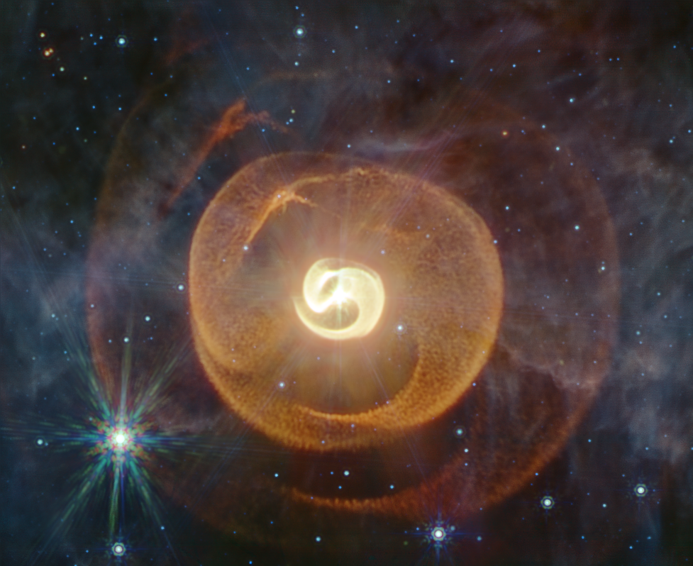 Телескоп "Джеймс Вэбб" ( JWST ) сделал новую фотографию тройной звезды Апеп (латинскими буквами  - Apep), которая принадлежит к классу звезд Вольфа-Райе ( Wolf-Rayet ).