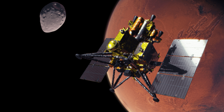 The spacecraft will explore both moons and collect a sample from Phobos to bring back to Earth.