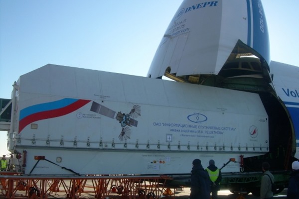 Контейнер со спутни­ком тяжелого класса пере­возится на самолёте АН-124 «Руслан». Там своя специфика погрузки: с помощью бортовых грузовых лебёдок контейнер затягивается в гру­зовой отсек через переднюю часть воздушного судна по специальной эстакаде. Потом открывается задний люк и загружается сопутствующий груз – различное оборудова­ние, которое весит суммарно от 10 до 15 тонн, плюс кон­тейнер со спутником – ещё 12-13 тонн.