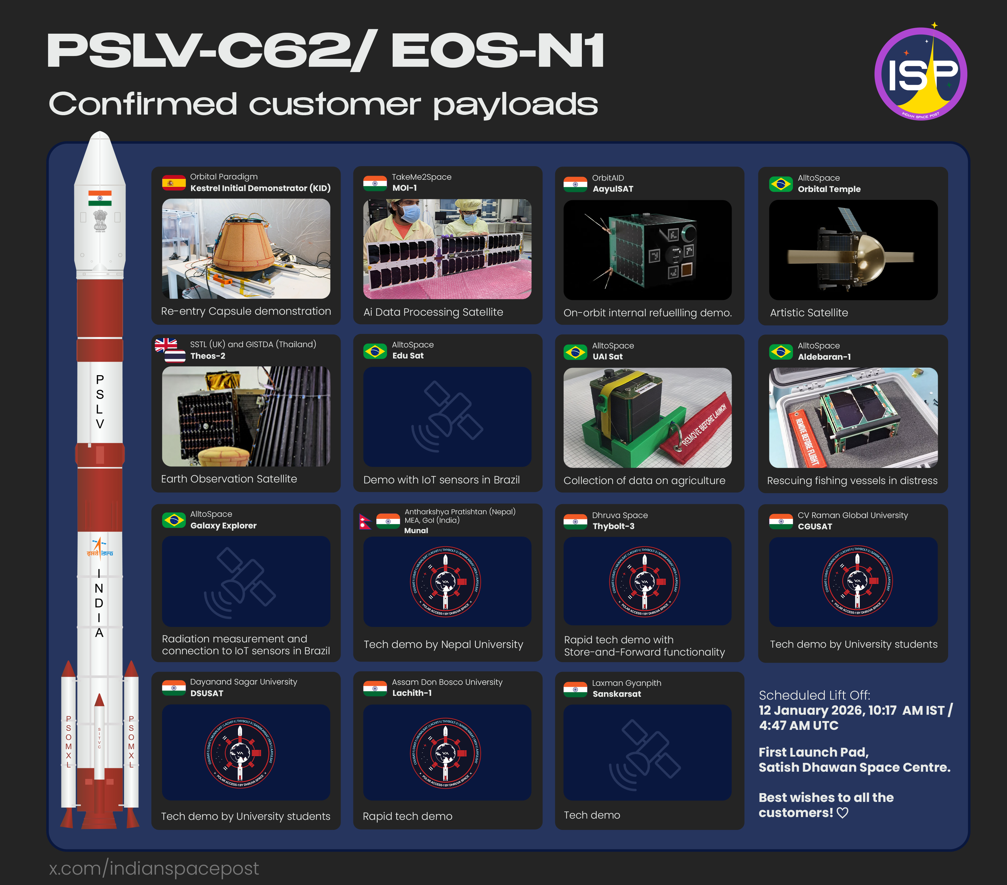 ЦитироватьPSLV-C62 is slated to lift off on 12 Jan 2026 at 10:17 AM IST from FLP (First Launch Pad). The primary payload is EOS-N1 (Anvesha) and also carries 18 co-passenger payloads. This mission will use the PSLV-DL variant (2 Strap-on boosters). This mission marks PSLV's return to flight following the failure of the C61 mission.