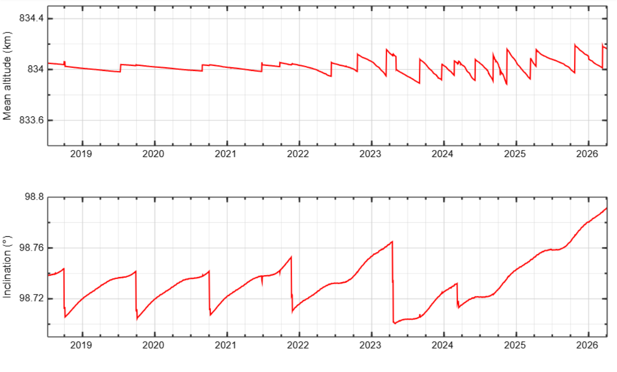 Цитата: Старый от 05.04.2026 06:01:04Сентинел жив и продолжает по два раза в год 200-метровыми коррекциями поддерживать орбиту 826.8-827.0 км