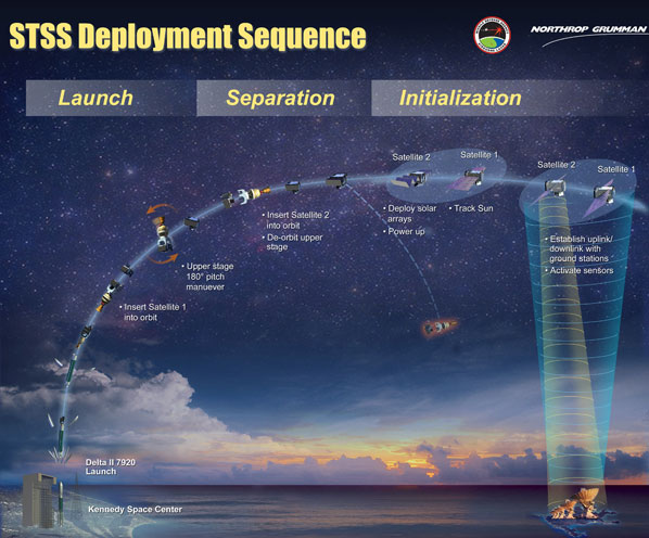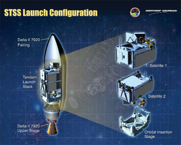 The STSS Demo mission has been in the works for years. Northrop Grumman built the spacecraft and was responsible for overall satellite integration, plus the ground control system. The satellites' sensors were made by Raytheon.