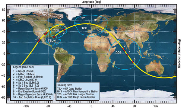 The two-stage rocket is aiming for a 730-nautical-mile circular orbit inclined 58 degrees to the either side of the equator where it will deploy a pair of demonstration satellites for the Space Tracking and Surveillance System, a $1.5 billion project known as STSS Demo.