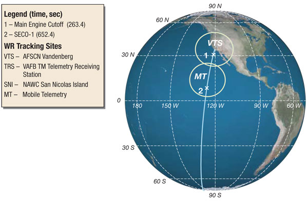 After initially flying from Vandenberg along a 196-degree flight azimuth, the rocket begins steering itself to obtain the desired orbital inclination. This dog-leg maneuver continues for 52 seconds.