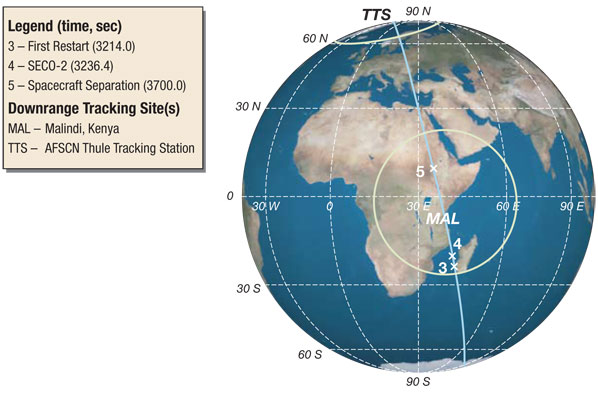 T+plus 45 minutes. Maps illustrating the rocket's flight carrying the WorldView 2 satellite can be viewed here.