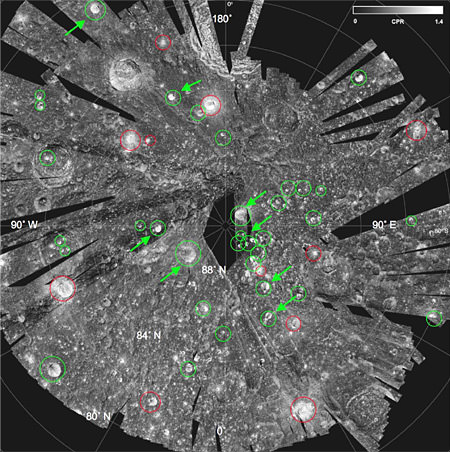 3. Третий источник составляют около 40 кратеров , обнаруженных прибором Mini-SAR, на борту Chandrayaan-1, каждый из которых содержит по крайней мере 2 метра замерзшей воды, в сумме составляющей свыше 600 миллионов тонн чистого льда.