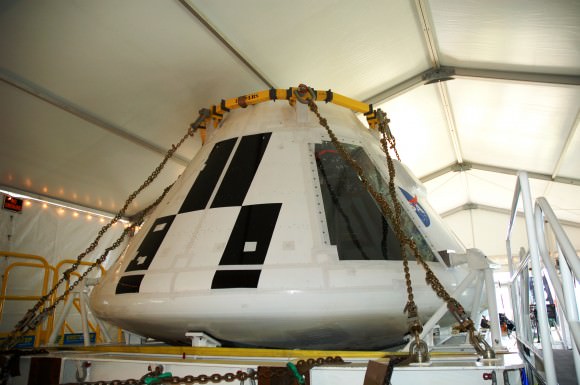 A scale model of Boeing's CST-100 spacecraft undergoes wind tunnel tests at NASA Ames Research Center. (Credit: Boeing)