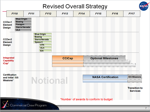 В рамках новой программы Commercial Crew Integrated Capability (CCIC) разработчики кораблей для доставки астронавтов на околоземную орбиту и, в частности, для полетов на МКС должны будут представить план действий на 21 месяц - от момента выделения гранта до мая 2014 года. За это время нужно представить полностью готовые к работе пилотируемый корабль, ракету-носитель, а также пусковой комплекс и систему управления полетом на земле. Кроме того, НАСА хочет видеть и приблизительный план дальнейших действий, кульминацией которого станет демонстрационный пилотируемый полет на околоземную орбиту.