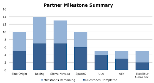 NASA now has funded Space Act Agreements with Boeing Co., SpaceX, Sierra Nevada Corp. and Blue Origin worth a combined $316 million. Each company is working on a commercial crew spacecraft, and the agreements run through May.